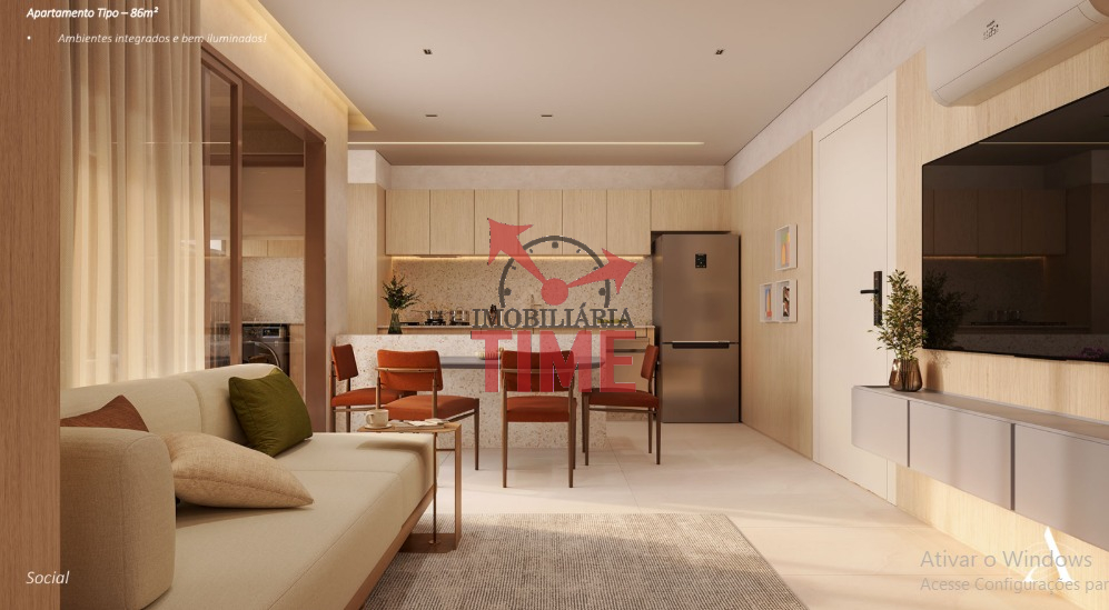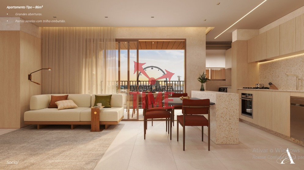 A cozinha é moderna e funcional, com armários planejados e espaço para uma mesa de café da manhã. A área de serviço é separada e conta com aquecedor para maior comodidade. A sala possui janelas amplas, trazendo muita iluminação natural e uma sacada para aproveitar os dias ensolarados.