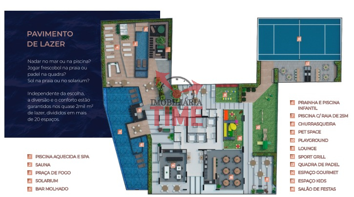 O lazer é um espetáculo à parte, com mais de 20 opções: rooftop com vista permanente para o mar, piscina aquecida com raia de 25m, prainha, spa, sauna, bar molhado, sport grill, quadra de padel, espaço fitness, yoga, cinema ao ar livre, pub, espaço gourmet, kids, pet space, salão de festas e muito mais.