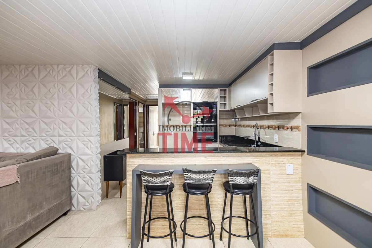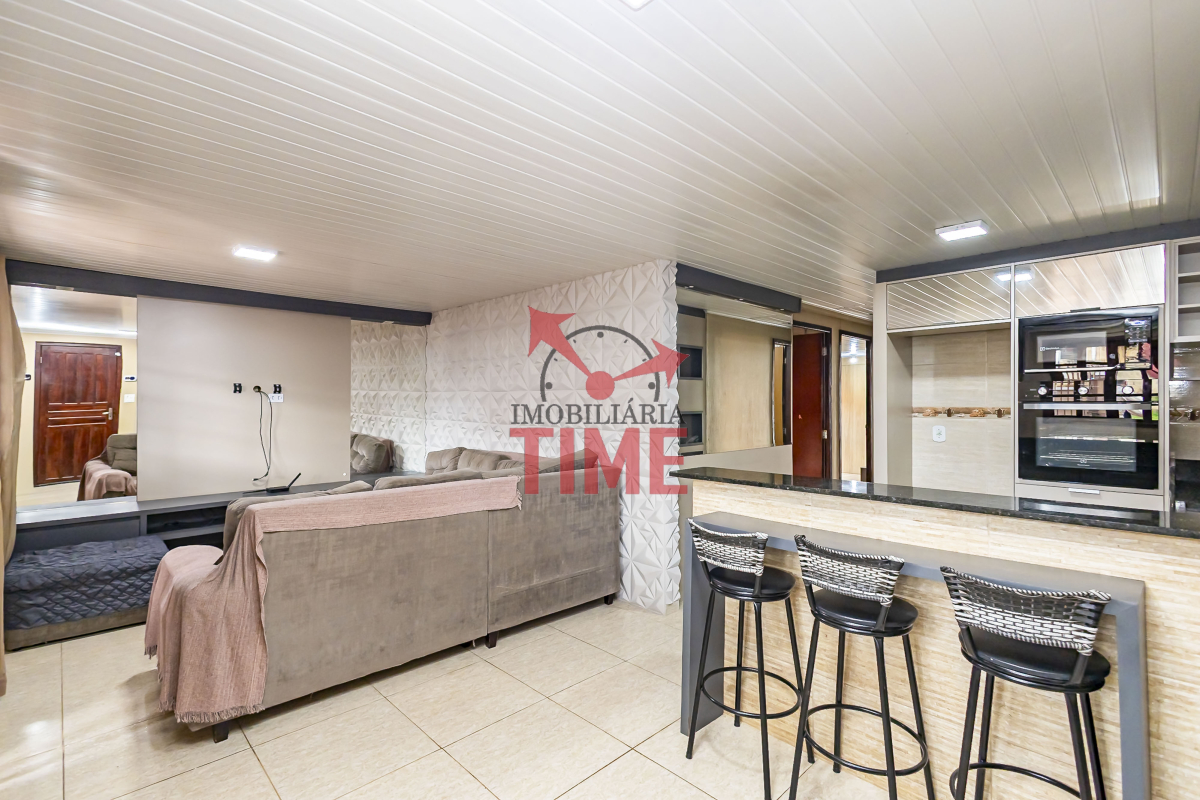 A sala de estar é integrada à cozinha, criando um ambiente aconchegante e funcional, ideal para reunir família e amigos.