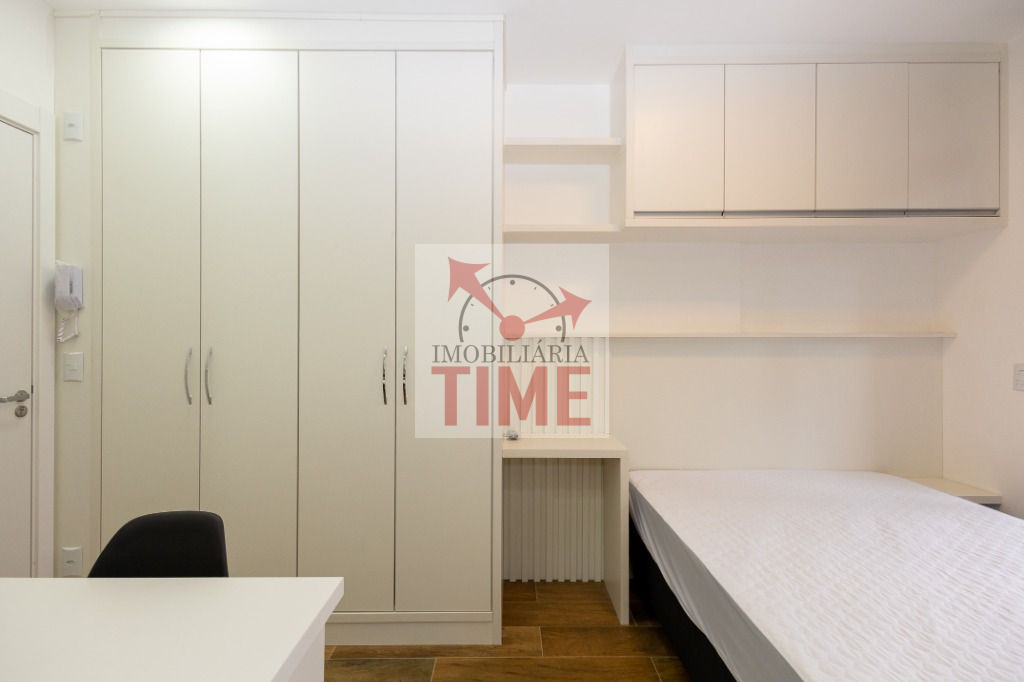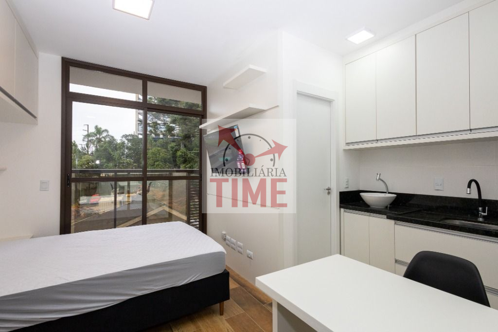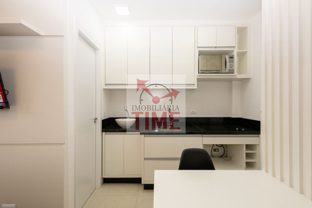 Apartamento mobiliado, equipado com geladeira, cooktop (indução), micro-ondas e TV.